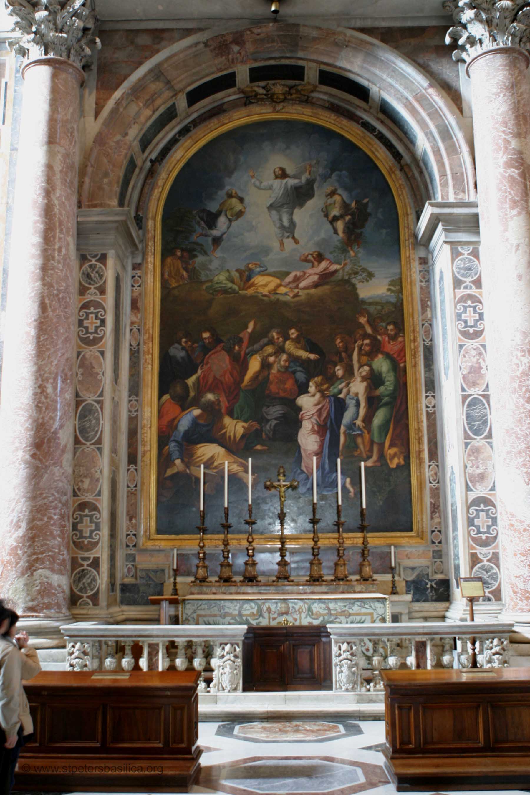 'Guide to Saint Peter's Basilica' It shows the Lord in a nimbus of bright light, raised in the air with the prophet Elias and Moses, the lawgiver, while the three favored apostles, Peter, James and John gaze on this heavenly scene from earth, wishing that it would last for eternity. The upper portion of the picture reveals the tranquil ecstasy, the celestial serenity and peace the Lord grants only to those who are with Him and who want to be with Him. The lower part contrasts strongly with the upper. The figures are agitated; they look at the possessed boy whose father is holding him. All are troubled, and they seem to be seeking a human solution to ills of the spirit. Only an apostle, indicating the Lord on the Mount reminds them, the disheartened and discouraged, of the source of salvation. In the middle, the kneeling woman symbolizes the Church and its task of bringing peace, hope and faith to the victims of evil. Raphael died young, he was only 37. In his final delirium he asked to see his painting for the last time. His friends brought it to him, and placed it on the bed in which he died on Good Friday, 1520. The same painting was carried at the head of the funeral procession to the Pantheon where the great artist is buried and awaits his own transfiguration. From: 'The Mosaics