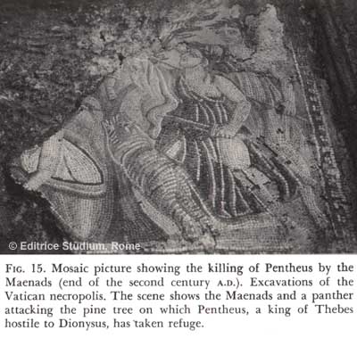But if the bodies remained physically in the tombs, did the souls also stay there? Or did they go off to dwell somewhere else, in distant, mysterious lands? On the floor of one tomb there is a mosaic showing the symbolic scene of the maiden Proserpina, abducted by Pluto, god of the dark underworld, while she was gathering flowers (Fig. 19). This scene agrees very well with the belief, widespread among the ancients, that the souls off the dead went beneath the earth into the silent kingdom of Avernus, to wonder there, pale shadows, in darkness. On the wall of other tombs are shown idyllic landscapes, or cornucopias overflowing with flowers, fruits and corn: pictures which seem to refer to those far-off isles of the blest to which - according to another idea - the souls set out, anxious to enjoy at last a serene life in a perpetual holiday of light and joy. Other walls of the necropolis show us painted pictures of Psyche and of little Cupids; and these pretty winged beings remind us that, according to an idea fairly common at the time, spirits flew into the sky, to find their final resting place among the stars or in the halo of the moon's silvery light.
