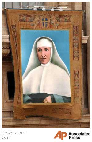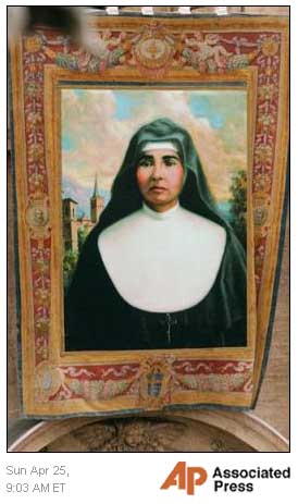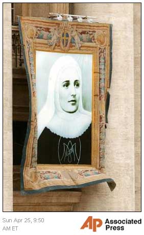 tapestry of Colombian sister Laura Montoya hangs from St. Peter's